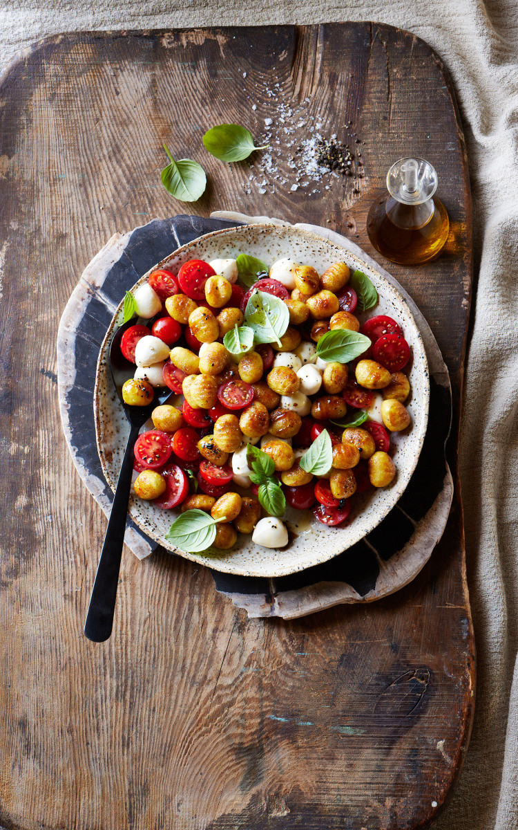 Die Pfannen Gnocchi mit den gut getrockneten Kirschtomaten, den kleinen Mozzarellas und den Basilikumblättern anrichten.
