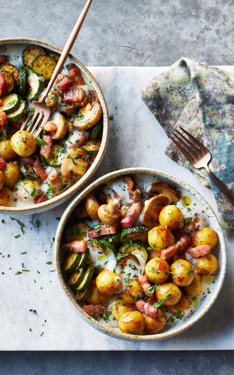 Die Pfannen Gnocchi mit den Pilzen, Zucchini und dem Speck auf einem Teller anrichten und mit leicht geschlagener frischer Sahne beträufeln, um eine weiche und zarte Textur zu erhalten. Nach Geschmack Petersilie hinzufügen.