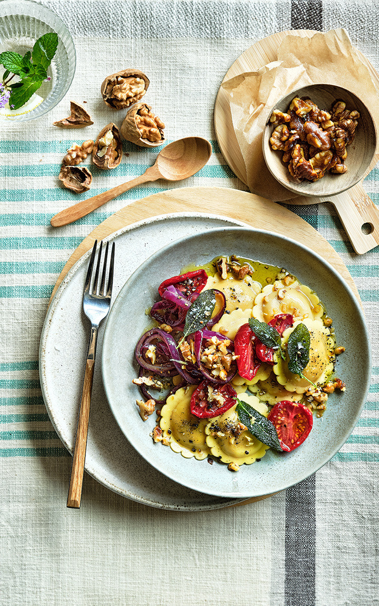Die Girasoli in reichlich Salzwasser für die auf der Packung angegebene Zeit kochen, abgießen und mit den karamellisierten Zwiebeln, den sonnengetrockneten Tomaten und einem Spritzer Öl würzen. Auf Tellern anrichten, mit Walnüssen, einer Prise Pfeffer und den gebratenen Salbeiblättern bestreuen und servieren.