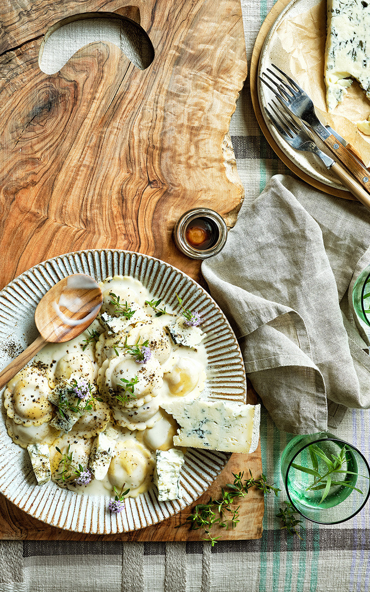 Kürbis und karamellisierte zwiebeln mit blauschimmel-käsefondue