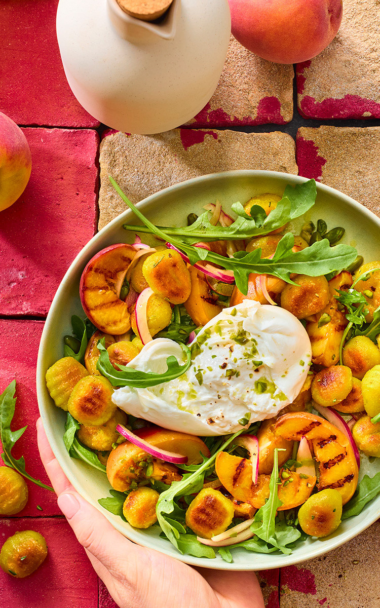 LAUWARMER PFANNEN-GNOCCHI-PFIRSICH-SALAT MIT BURRATA