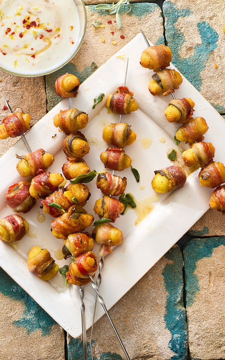 Bacon auf der Arbeitsfläche auslegen und der Länge nach mittig zusammenfalten. Jede Speckscheibe in 3 gleich große Teile schneiden. Salbei waschen und trocken tupfen. Auf jede geschnittene und gefaltete Scheibe Bacon ein Salbeiblatt und ein Gnocchi legen. Bacon um Gnocchi und Salbei fest aufrollen. Mehrere aufgedrehte Gnocchi auf Spieße spießen – dabei darauf achten, dass die Specköffnungen aneinanderstoßen, damit die Rollen beim Braten nicht auseinanderfallen. Spieße in eine Pfanne geben und von jeder Seite ca. 3 Minuten anbraten bis der Speck kross ist. Butter dazugeben und Spieße darin nachgaren. In der Zwischenzeit Zitrone heiß abwaschen, trocken tupfen und die Schale abreiben. Zitrone halbieren und den Saft auspressen. Zitronenschale, Zitronensaft, Honig und Chili mit Joghurt vermengen. Gnocchi-Spieße mit Joghurt als Dip servieren.