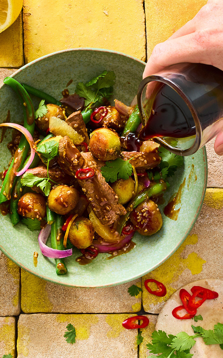Bohnen waschen und in kochendem Salzwasser ca. 10 Minuten kochen. Gekochte Bohnen nach dem Kochen in kaltes Wasser geben und abkühlen. In der Zwischenzeit Zwiebel schälen, halbieren und in halbe Ringe schneiden. Zitrone, Peperoni und Koriander waschen und trocken tupfen. Zitronenschale dünn herunter (Sparschäler) und in feine Streifen schneiden, die restliche weiße Haut abschneiden und Zitronenfilets herauslösen. Peperoni in dünne Scheiben schneiden. Koriander mit Stielen grob hacken.Die Hälfte des Rapsöls in einer Pfanne erhitzen, Pfannen-Gnocchi dazugeben und ca. 5 Minuten bei mittlerer Hitze kross anbraten und aus der Pfanne auf einem Teller beiseite stellen.Rinderfilet in ca. 1 cm dicke Streifen schneiden. Das restliche Rapsöl in einer Pfanne erhitzen. Rinderfiletstreifen dazugeben und ca. 1 Minute scharf anbraten, dann ebenfalls aus der Pfanne nehmen und beiseite stellen.Zwiebeln, Zitronenschalen und Peperoni in die heiße Pfanne geben und im Sesamöl ca. 2 Minuten anbraten. Bohnen, Sesam und Teriyaki-Sauce dazugeben und vermengen. Pfannen-Gnocchi und Fleisch dazugeben und kurz vor dem Servieren Zitronenfilets und Koriander unterrühren.