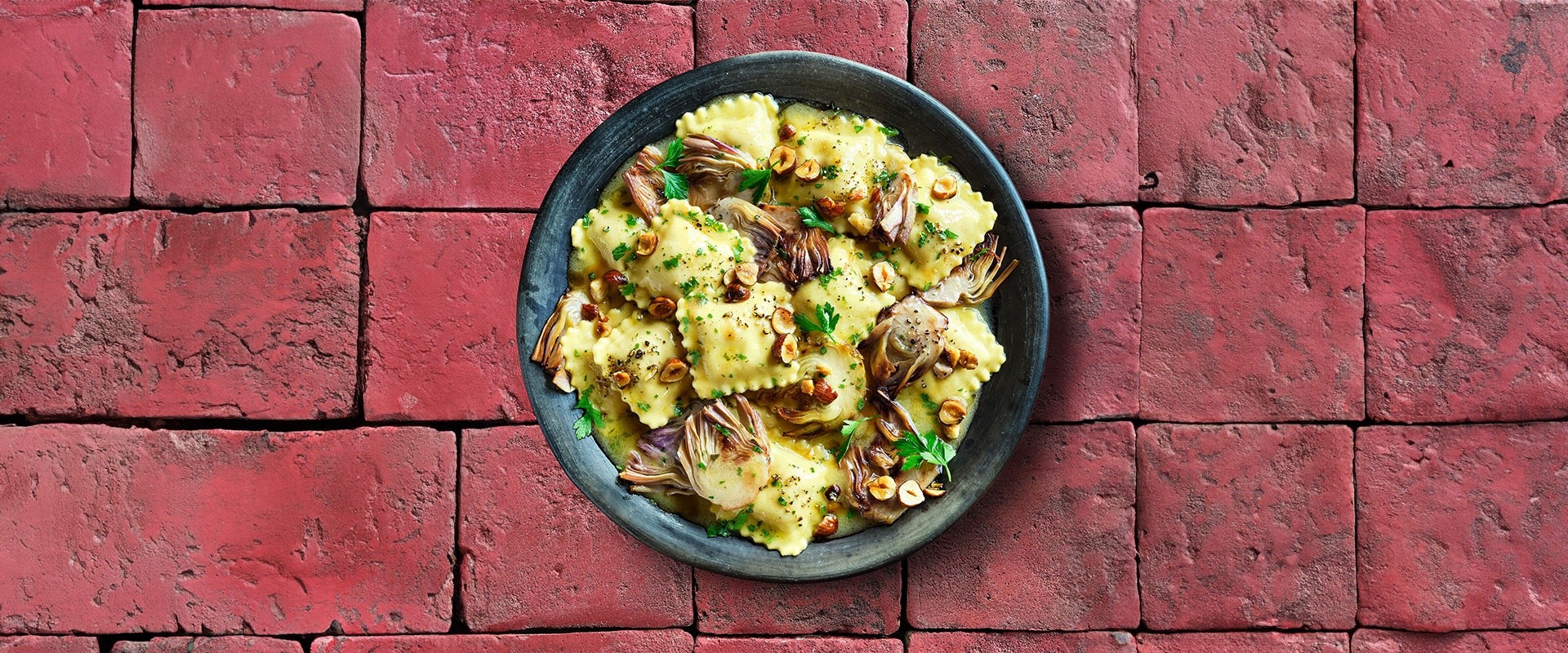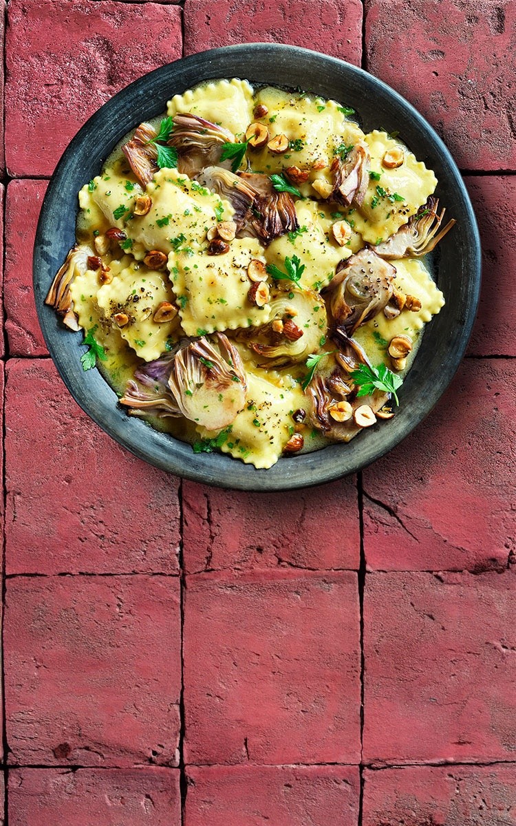 RAVIOLI FONDUE-KÄSE UND SCHWARZER TRÜFFEL MIT GERÖSTETEN ARTISCHOCKEN, HASELNÜSSEN UND PETERSILIENÖL