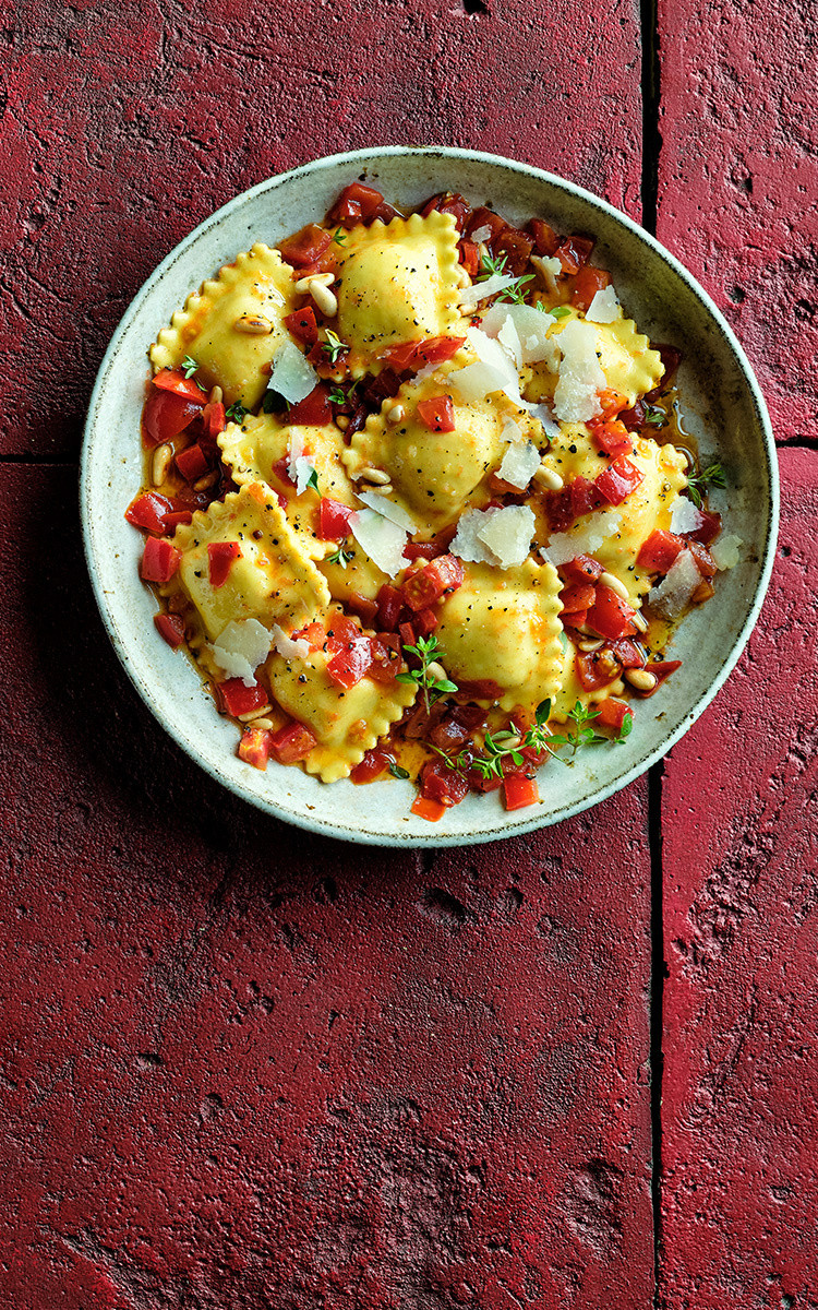 Ravioli in reichlich kochendem Salzwasser garen, abgießen und zusammen mit den Tomaten anrichten.