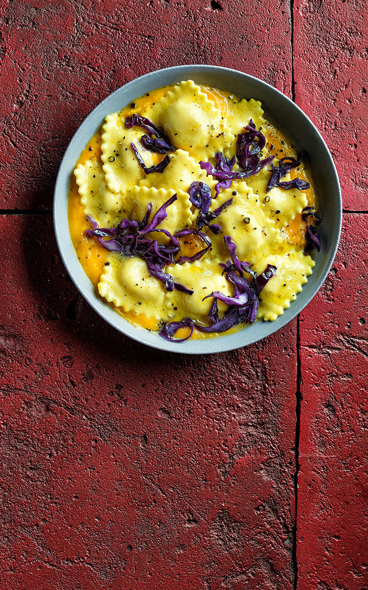 RAVIOLI GEFÜLLT MIT KALBSBÄCKCHEN IN ROTWEIN GESCHMORT MIT KÜRBIS-ZIMT-CREME UND GESCHMORTEM ROTKOHL