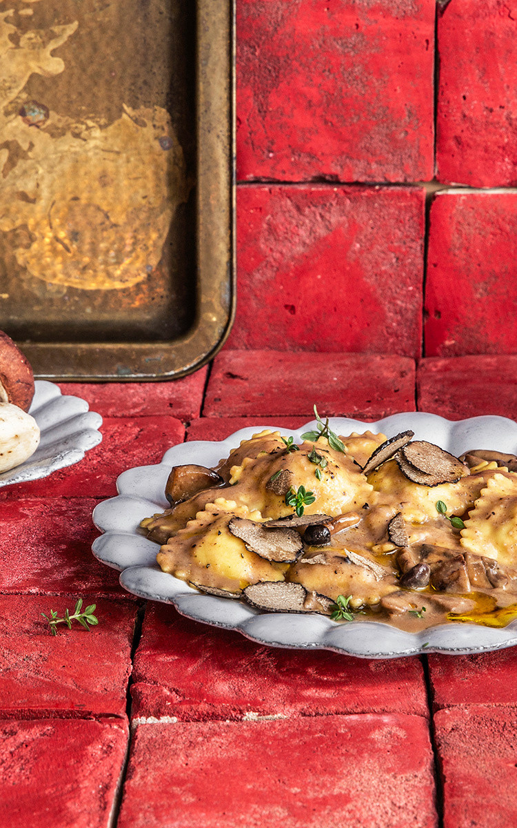 RAVIOLI GEFÜLLT MIT KALBSBÄCKCHEN IN ROTWEIN GESCHMORT PILZ- UND SCHWARZER TRÜFFELSAUCE