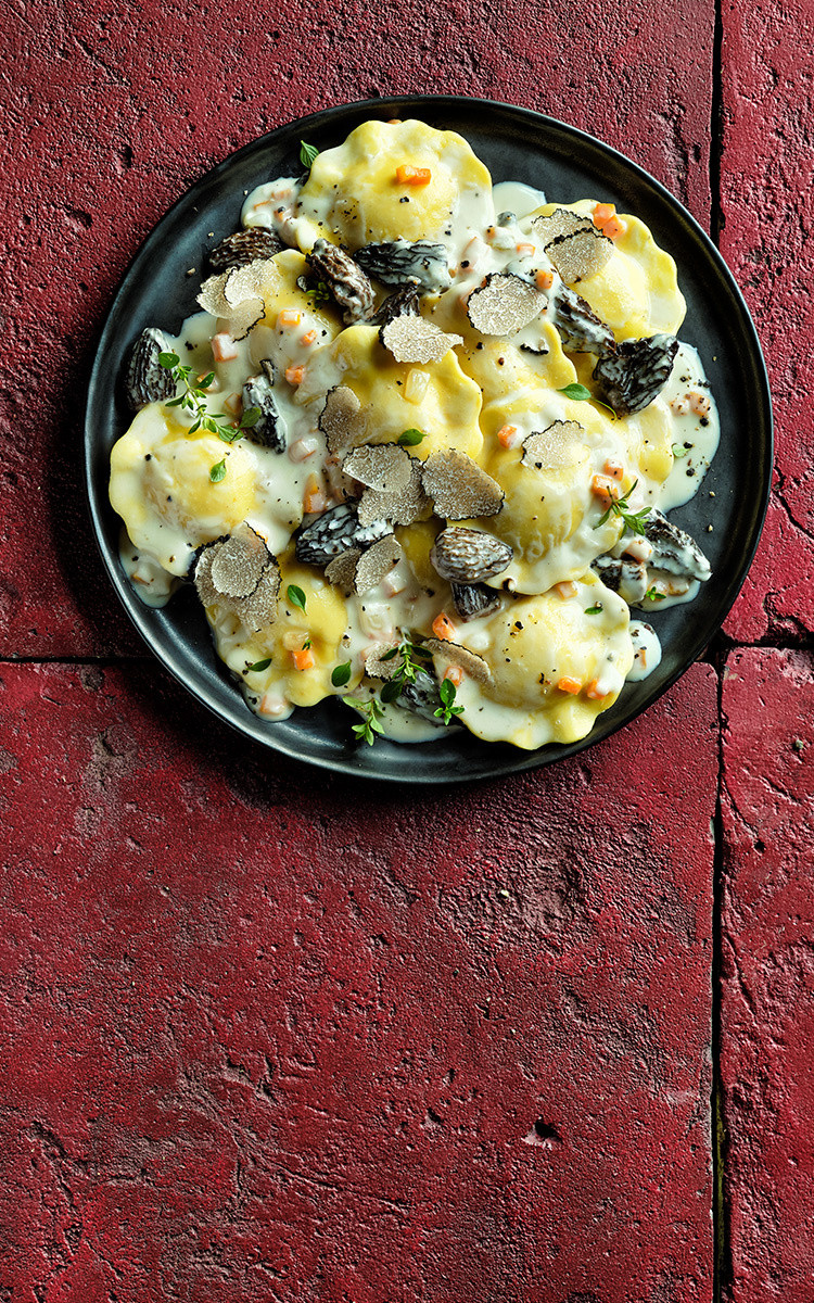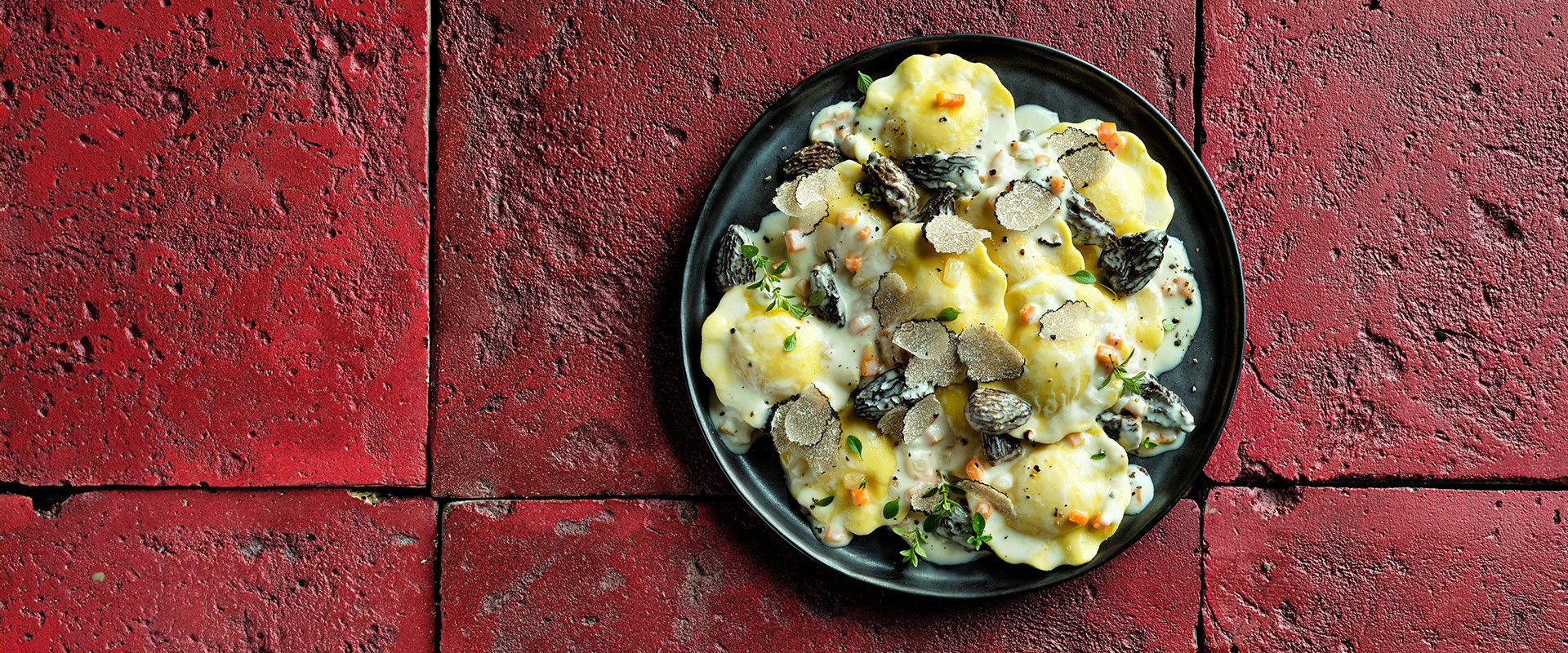 RAVIOLI GEFÜLLT RINDERBRATEN IN ROTWEIN GESCHMORT, MASCARPONECREME, MORCHELN UND TRÜFFELSPÄNEN
