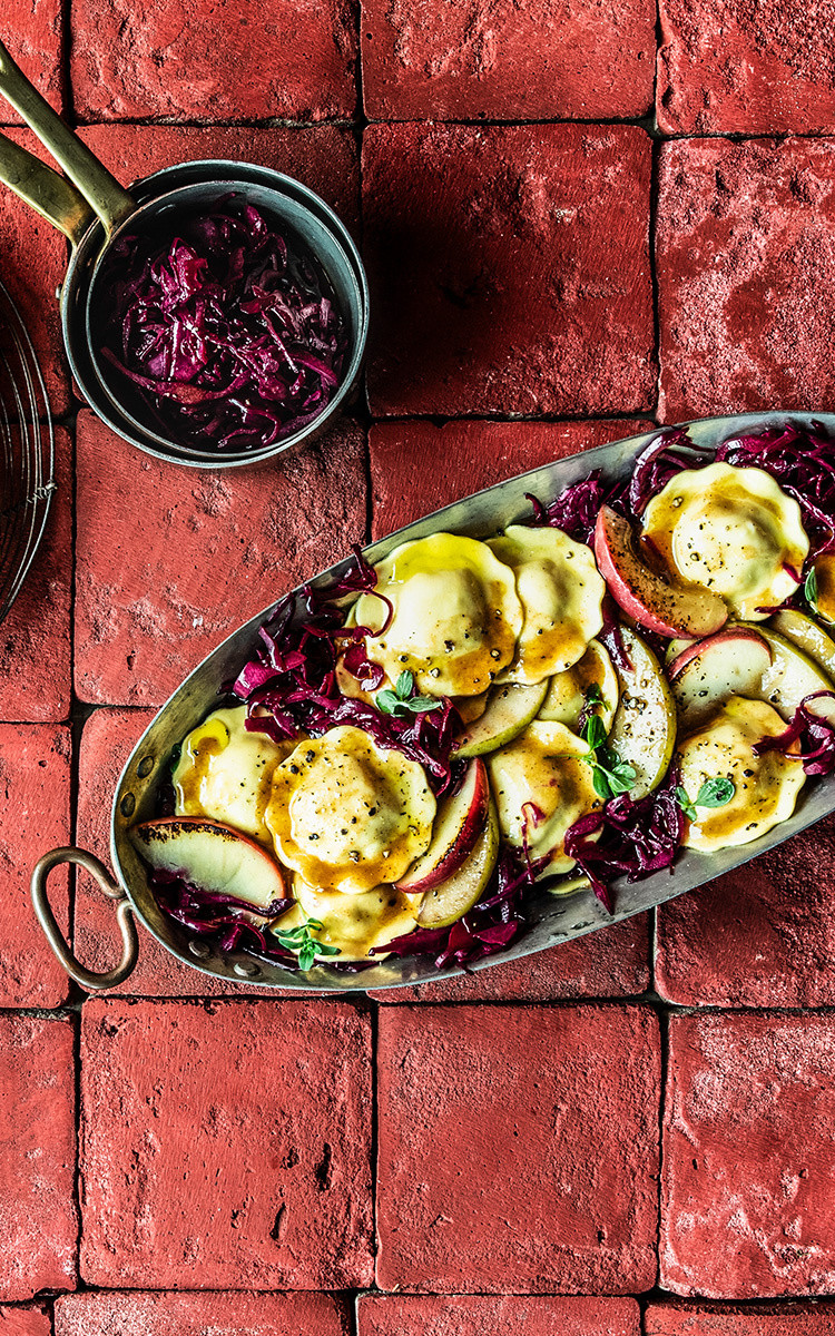 RAVIOLI HUMMER UND GARNELEN MIT ROTKOHL UND ÄPFELN