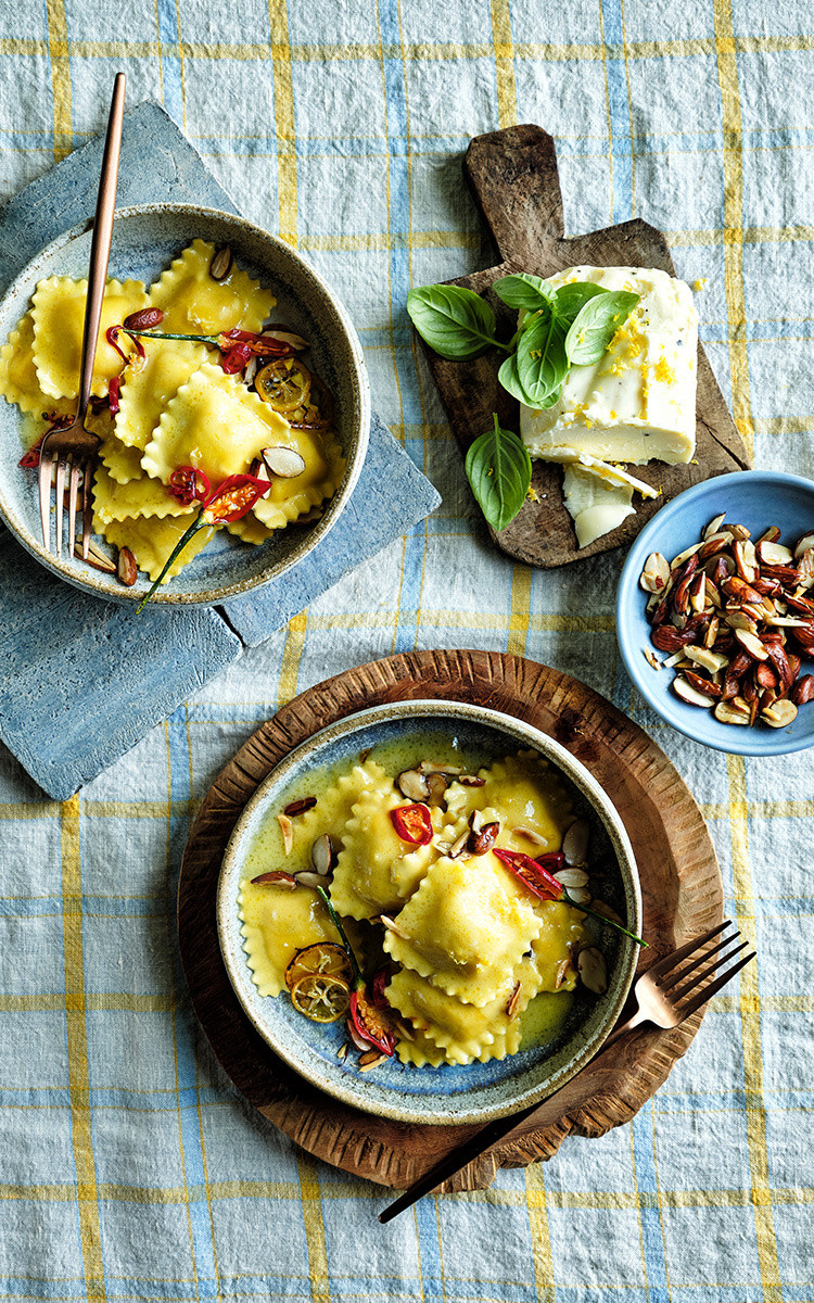 Ravioli ricotta und spinat mit zitronen-chili-mandel-butter